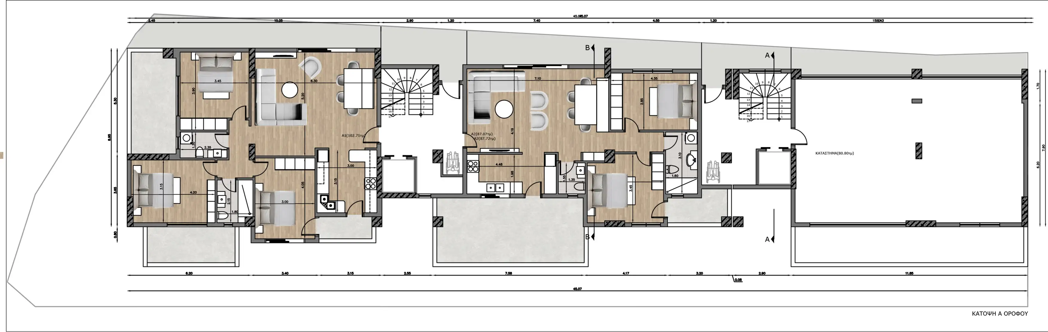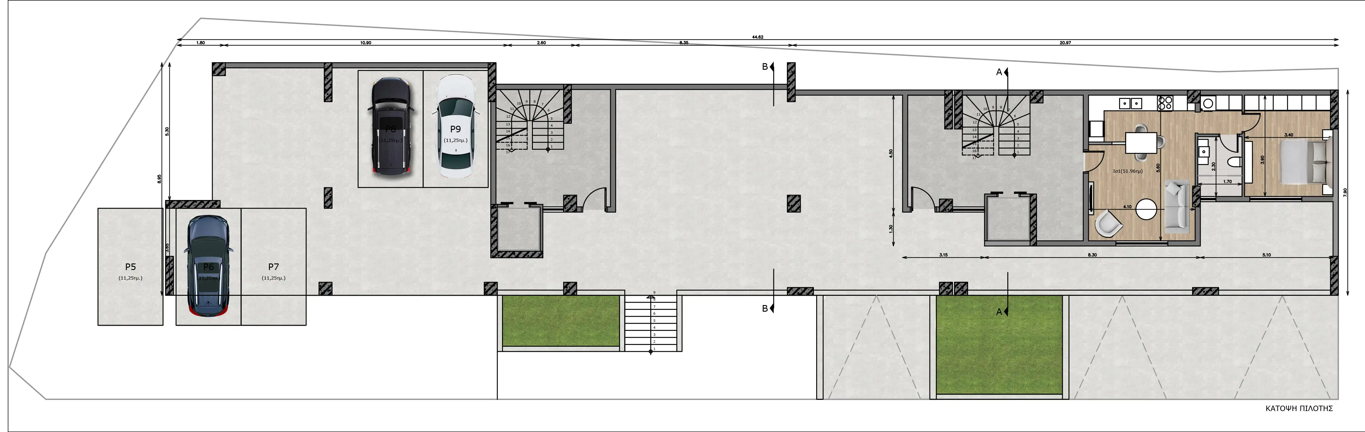 Located in the beautiful area of Aroi, Patras, this modern building is the ideal destination for those seeking comfort, luxury, and an upgraded quality of life. With a total area of 1,151 square meters, this apartment complex stands out for its modern architectural design and high-quality amenities.